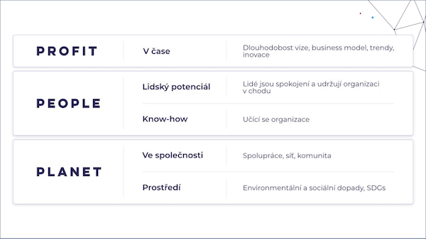 Pojem udržitelnost firmy je definován jako střet profitu firmy, péče o lidi v ní a péče o planetu – pro lepší představu podrobnější popis v obrázku níže.
