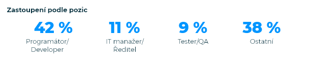 Na dotazník nám odpovědělo 85 % mužů a 12 % žen, 3 % respondentů byly jiného pohlaví. Větší polovina respondentů byla ve věku 25–34 let, převážně z Prahy a Brna z řad Programátorů/Developerů, IT manažerů/Ředitelů a Testerů/QA.