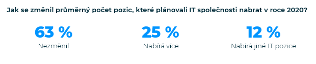 Při průzkumu mezi IT společnostmi jsme zjistili, že propouštění z řad IT specialistů proběhlo cca ve 12 % firem, a to především díky restrukturalizaci firmy, kdy se nabíraly IT specialisté na jiné pozice. U 63 % IT společností covid-19 neovlivnil průměrný počet IT pozic, které plánují do konce roku nabrat, u 25 % nabírají dokonce víc, než plánovali na začátku roku 2020.