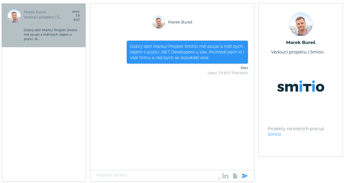 Součástí smitia je chat. Nemusíte se zdržovat s e-maily, formuláři ani oficiálním stylem. Prostě otevřete okno chatu a rovnou napíšete člověku, se kterým chcete mluvit.