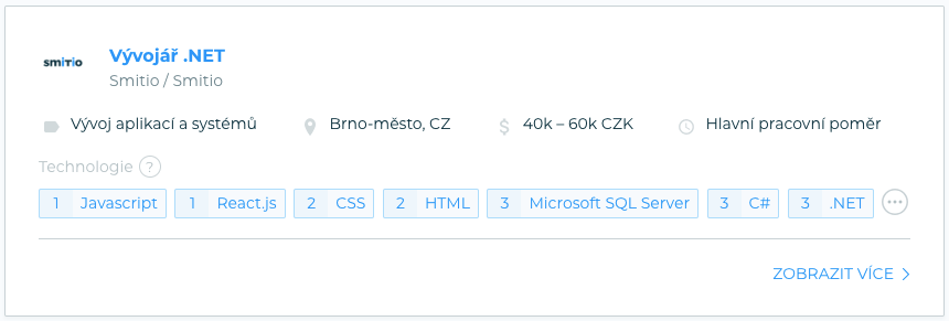 - Technologie mají formu tagů. U každé nabídky je uvedeno, jaké technologie jsou povinné a jaké jsou výhodou, takže hned máte přehled, jestli je nabídka pro vás.
