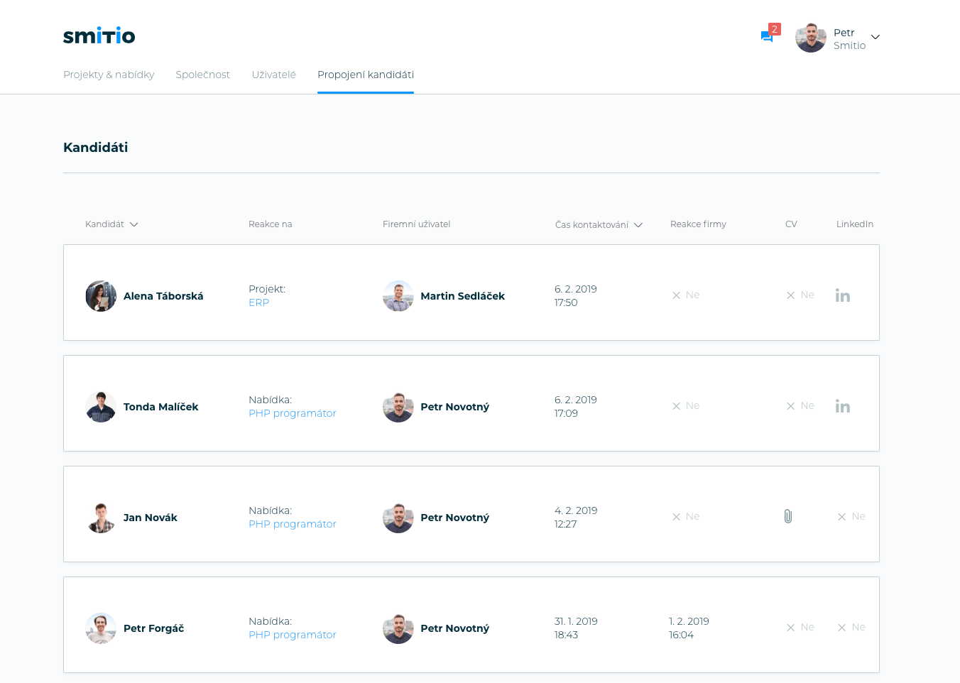 - Navíc má přehled o všech propojeních kandidátů přes smitio s jakýmkoliv firemním uživatelem v nové sekci Propojení kandidáti