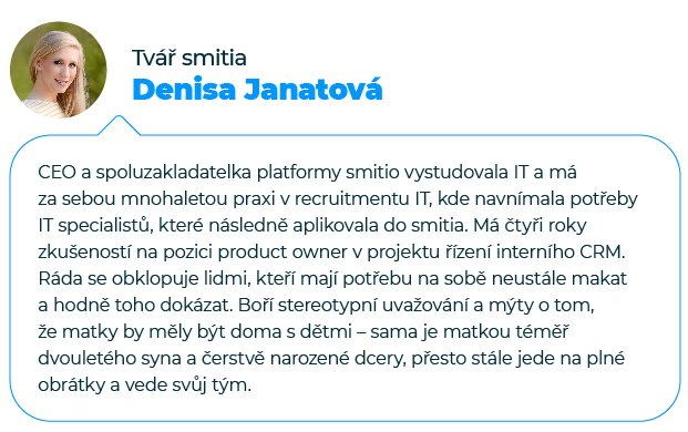Smitio je platforma, která usnadňuje komunikaci IT specialistům přímo s potenciálním nadřízeným. Pomáhá recruiterům urychlit nábor, teamleaderům lépe vybrat lidi do svého týmu a zájemcům o práci získat relevantní informace o pozici s minimem bullshitu kolem. A to se mi líbí.