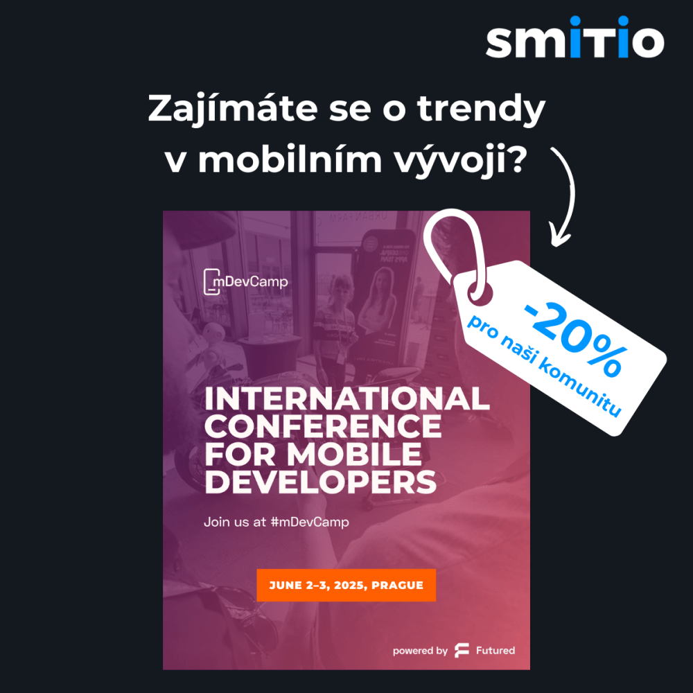 Díky smitio se nejen propojíte se zajímavými lidmi v komunitě, ale ještě navíc můžete získat exkluzivní slevy na lupeny na super akce.Máme velkou radost, že můžeme do naší komunity sdílet pozvánku na skvělou akci, která zas posune svět mobilního vývoje u nás o kus dál. mDevCamp 2025 v Praze a se slevovým kódem SMITIO20 to máte s 20% slevou. Nabušený program, inspirativní speakeři, skvělá moderátorka, bude to boží. Kompletní line up a program.