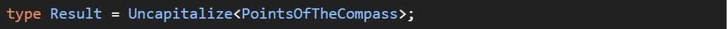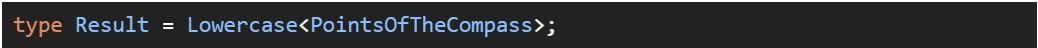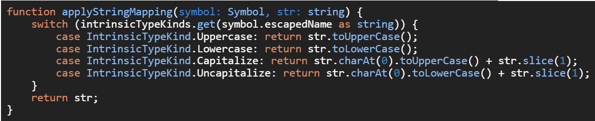 Výše zmíněné typy jsou z výkonnostních důvodů poskytovány TypeScriptovým kompilátorem a nejsou definovány v TypeScriptovém .d.ts souboru. Implementace těchto typů využívá přímo JavaScriptové funkce pro manipulaci s řetězci a nebere v potaz locale běhového prostředí (je to soubor parametrů, které definují uživatelův jazyk, stát a jiné zvláštnosti, které se následně projeví v uživatelském rozhraní). Implementace v TypeScriptu 4.1 vypadá následovně: