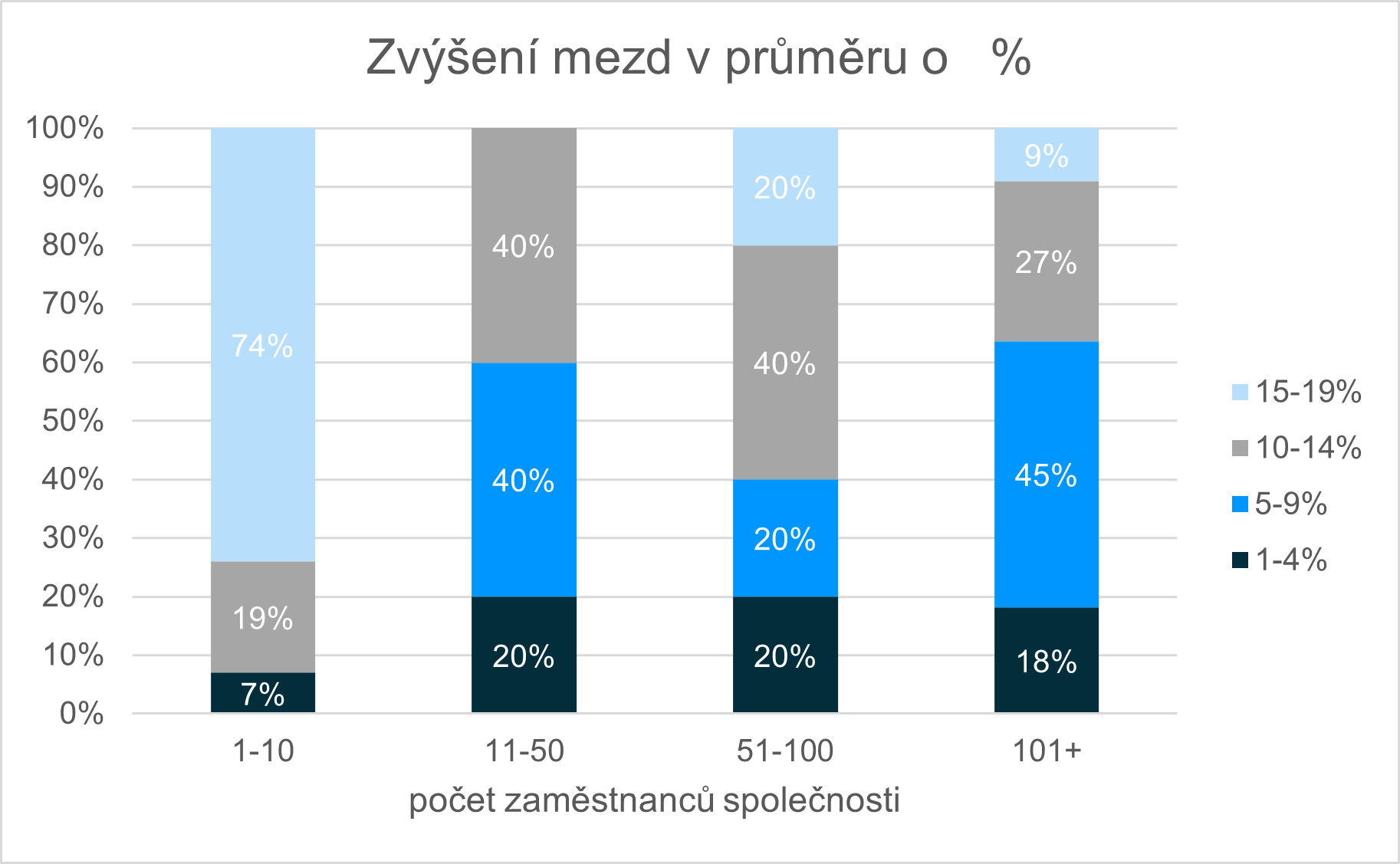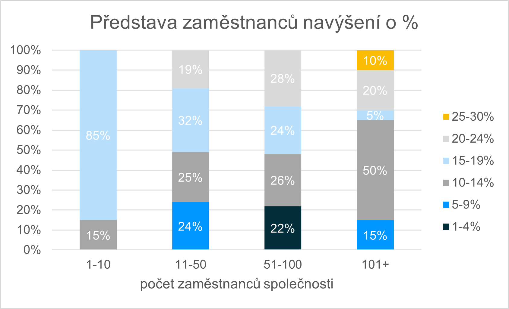 Představy zaměstnanců se pohybovaly mezi 10–15 % navýšením. Nejvíce si říkali lidé z velkých společností (100+), kde představa byla až 30 %. Nejskromnější byli ze středně velké firmy (51-100), kde čekali 2 %.